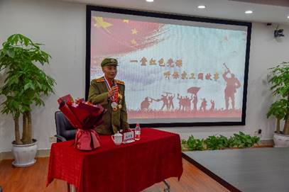 在專題黨課開始前,全體黨員觀看了中印邊境自衛反擊戰網絡視頻,黨委組織部副部長張昆對老英雄的事跡進行了簡要介紹,張甲剛代表黨政向老英雄送花,并致歡迎詞。